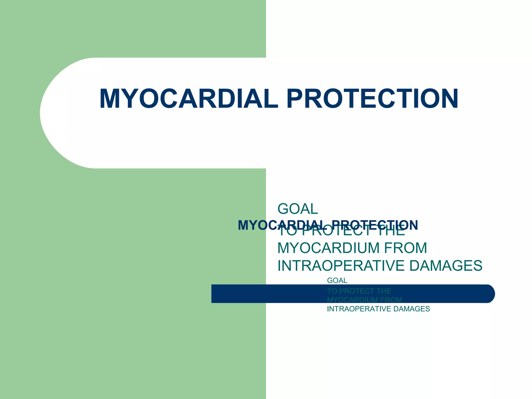 This document discusses various strategies for myocardial protection during cardiac surgery. It describes how ischemia and reperfusion injury can damage the myocardium. The goals of myocardial protection are to reduce oxygen demand, maintain adequate perfusion, and minimize injury during reperfusion. Techniques discussed include cardioplegic arrest, hypothermia, venting, intermittent clamping, and pharmacological additives to cardioplegia solutions. The optimal method balances protection against procedural complexity and aims to prevent intraoperative damage and ensure postoperative cardiac function.