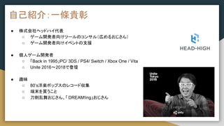 ゲーム開発者向けイベントの支援 ● 個人ゲーム開発者 ○ 「Back in 1995」PC/ 3DS / PS4/ Switch / Xbox One / Vita ○ Unite 2016~2018で登壇 ● 趣味 ○ 80’s洋楽ポップスのレコード収集 ○ 端末を買うこと ○ 刀剣乱舞おじさん、「 DREAM!ing」おじさん