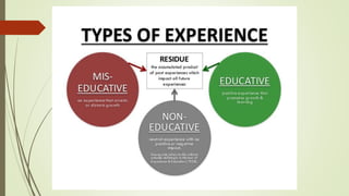 The document outlines the agenda and topics covered in a class about narrative inquiry. The class discussed John Dewey's views on experience and education. It also covered Connelly and Clandinin's three commonplaces of narrative inquiry - temporality, sociality, and place. The class involved activities applying these concepts to classroom experiences and discussed the importance of continuity of experience. Students were assigned to keep a timeline of experiences and give an oral presentation the following week.