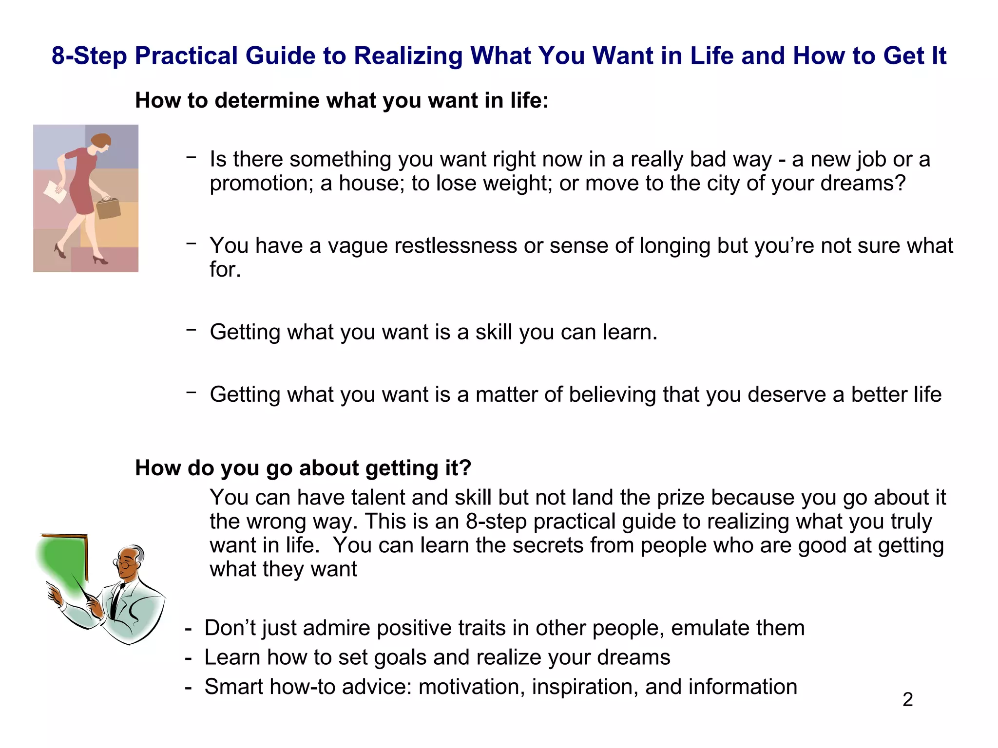 This document provides an 8-step guide to determining what you want in life and how to achieve your goals. It discusses techniques like using envy as motivation, finding patterns in your interests to identify desires, and emulating successful people. It emphasizes having passion and letting others see how helping you benefits them. Unconventional approaches like bold requests and clever strategies are also recommended over conventional advice that may stall progress.