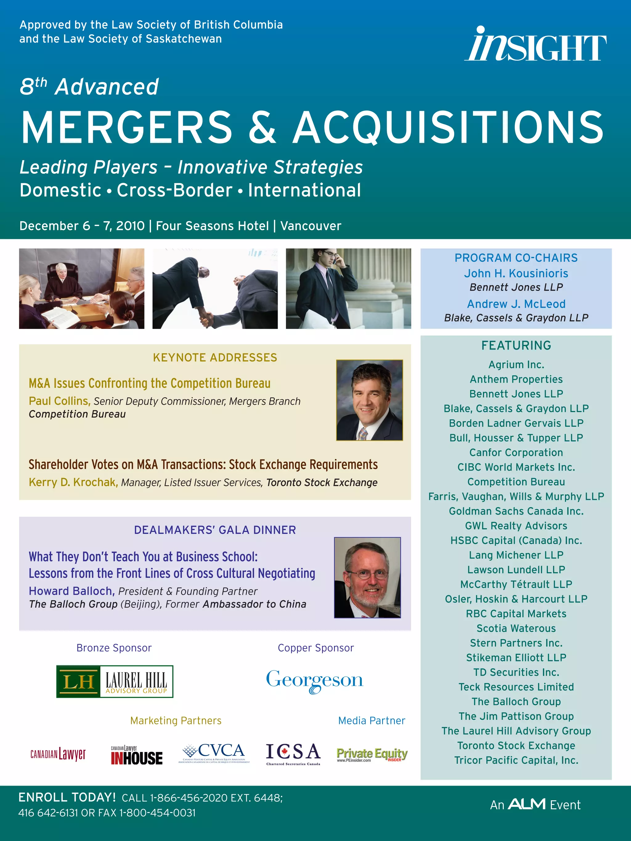 This document announces an upcoming conference on mergers and acquisitions featuring keynote addresses and panels from experts in various fields related to M&A. The conference will take place over two days and include discussions on current M&A trends and deals, regulatory issues, financing structures, negotiations, and other topics. A number of prominent law firms, investment banks, corporations and other organizations are listed as participating in or sponsoring the event.