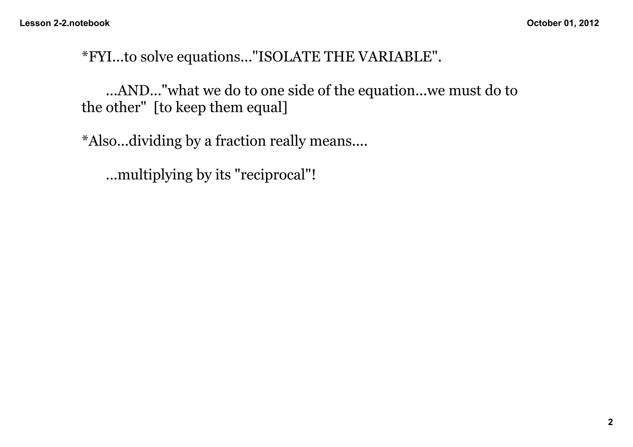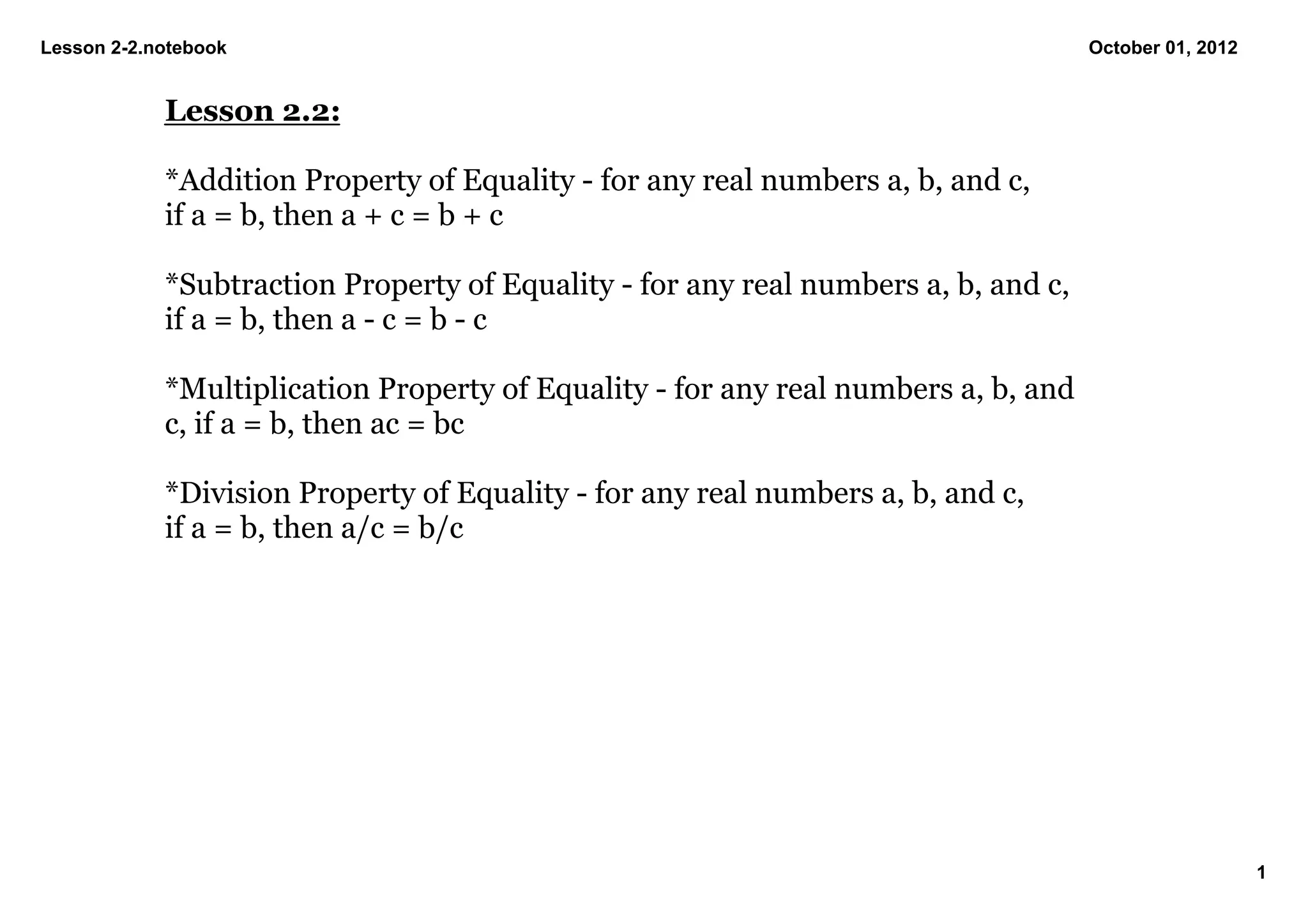 The document discusses the properties of equality, including the addition, subtraction, multiplication, and division properties. It explains that to solve equations, you must isolate the variable by doing the same operation to both sides of the equation. It also notes that dividing by a fraction means multiplying by its reciprocal. The document provides examples of solving simple equations and checking the answers.