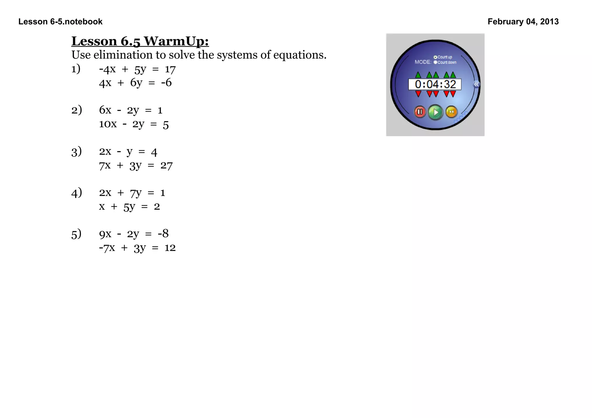 The document contains notes from a math lesson on solving systems of equations. It includes 5 practice problems asking students to determine the best method to solve each system (elimination, substitution, or graphing) and then to solve it. The final problem asks students to write and solve a system of equations to determine when two volunteers, Jack and Claire, will have volunteered the same number of hours based on their weekly schedules.