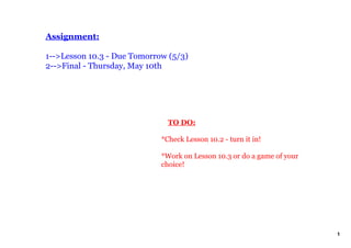 This document provides instructions for upcoming assignments, including that Lesson 10.3 is due tomorrow on May 3rd, the final exam is on May 10th, and students should check and turn in Lesson 10.2 or work on Lesson 10.3 or play a game of their choice.