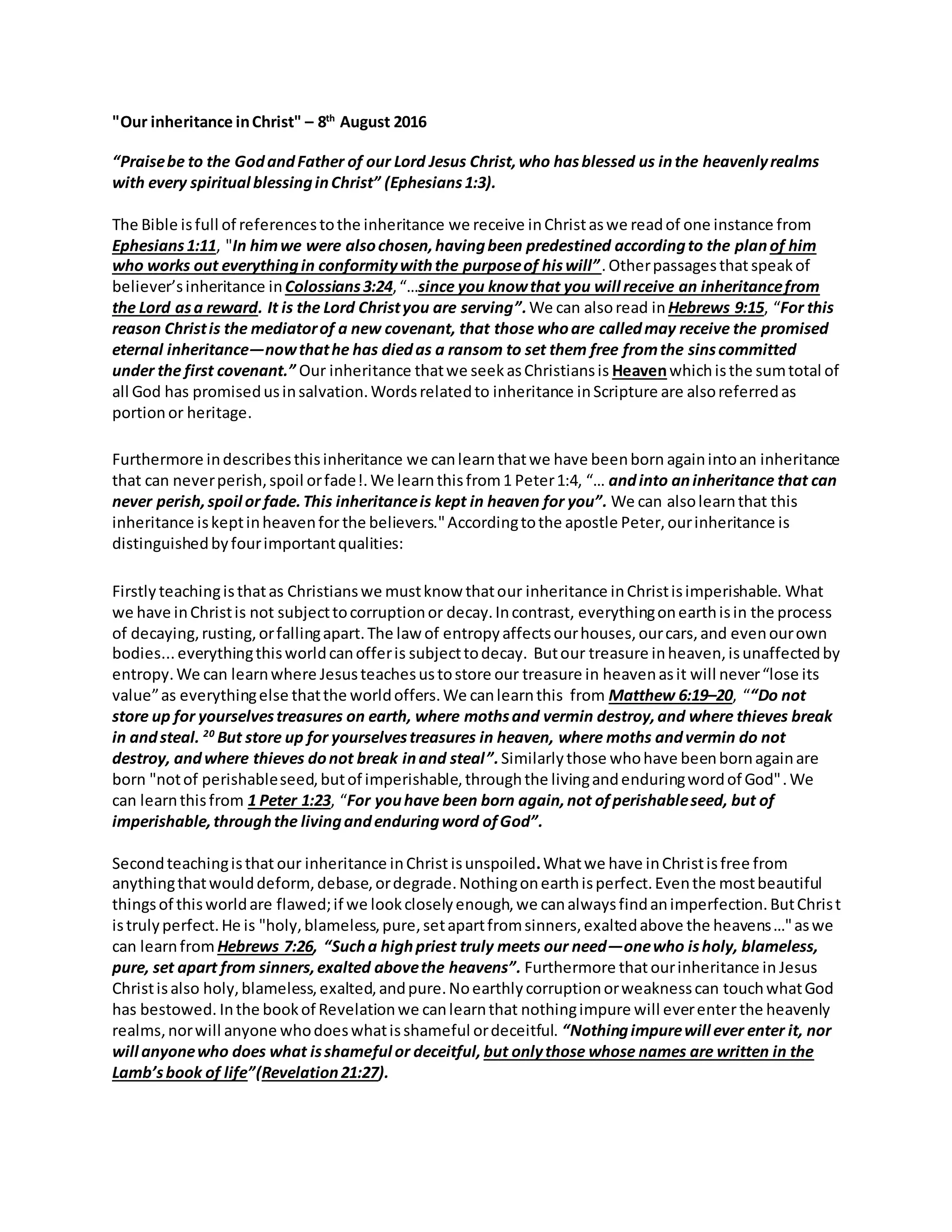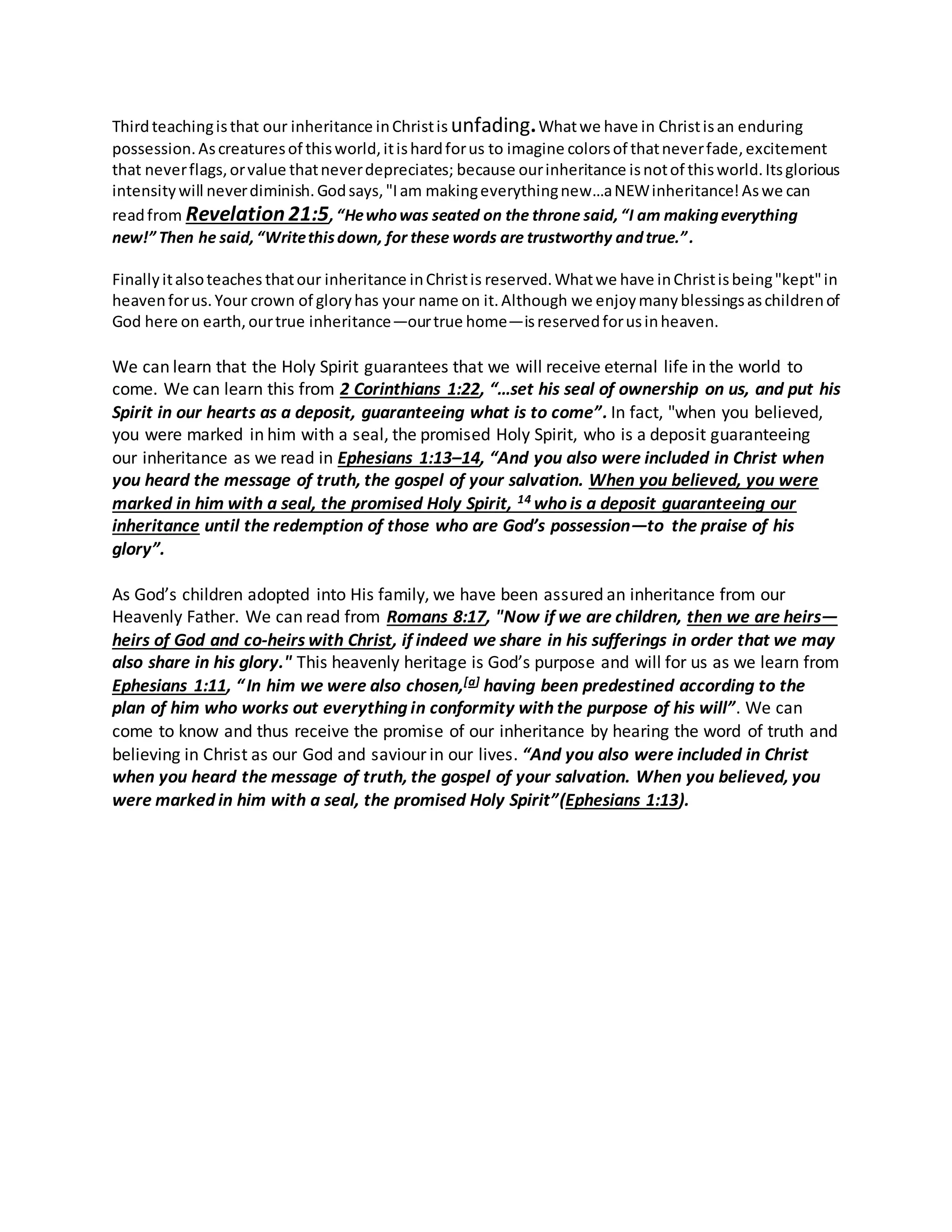 1) As Christians, we have an inheritance in Christ that is described as imperishable, unspoiled, and unfading. This inheritance is reserved for us in heaven and cannot be touched by anything of this earth.
