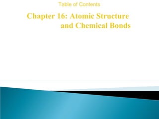 This document discusses atomic structure and how atoms bond. It begins by explaining that atoms are made up of protons and neutrons in the nucleus, and electrons in electron clouds surrounding the nucleus. Atoms bond by losing, gaining, sharing, or pooling electrons to achieve stable electron configurations like noble gases. For example, sodium loses an electron to become positively charged and chlorine gains an electron to become negatively charged, allowing them to bond ionically as sodium chloride. Magnesium can lose both of its outer electrons to form bonds.