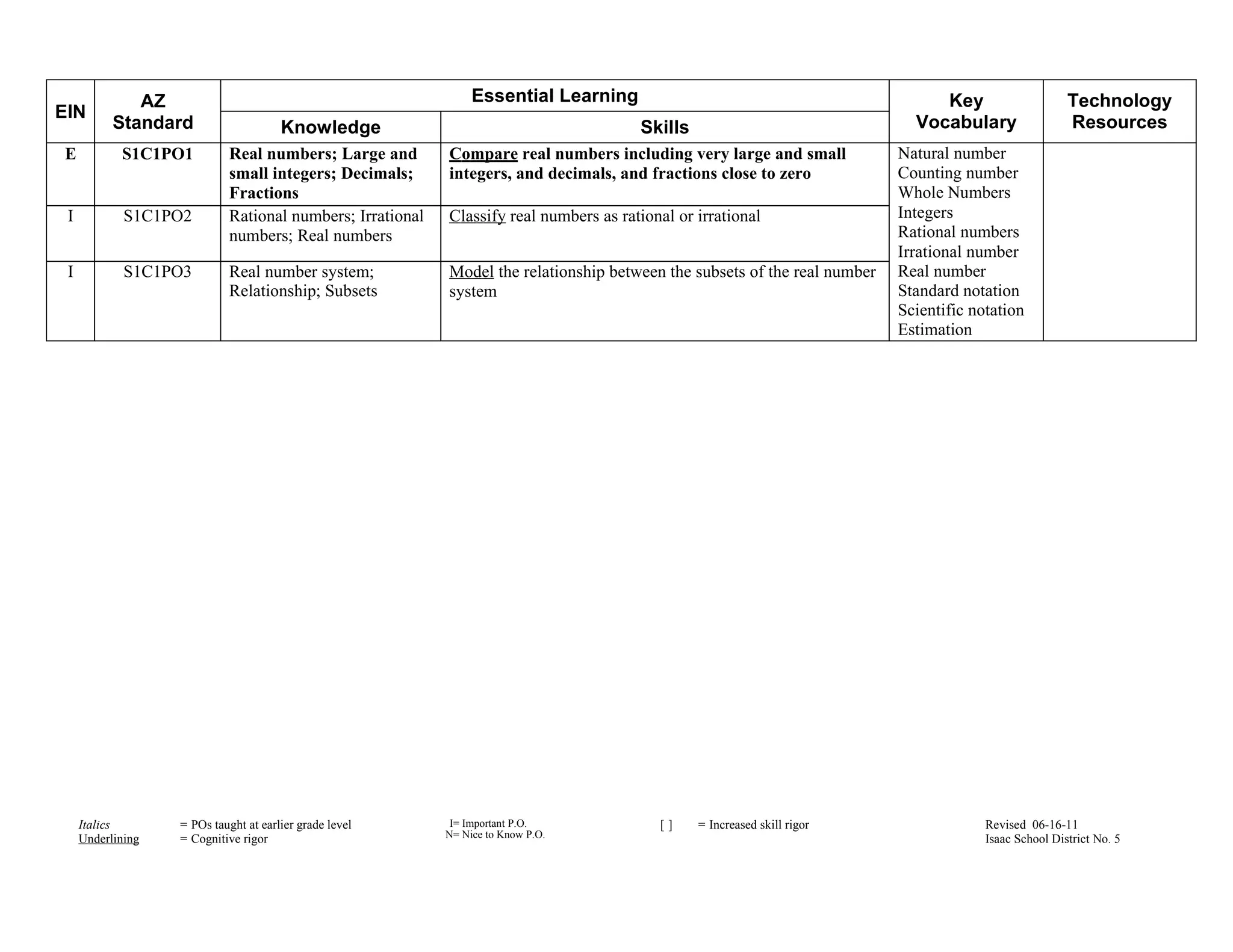 The 8th grade math curriculum map outlines the curriculum for the first two quarters. It includes six clusters that cover topics such as comparing and ordering real numbers, solving algebraic equations and inequalities, ratios and proportions, the Pythagorean theorem, functions and linear relationships, and geometric shapes. The document provides essential questions, learning objectives, and vocabulary for each topic. It also identifies which standards and skills are most important, increased in rigor, or previously taught at an earlier grade level.