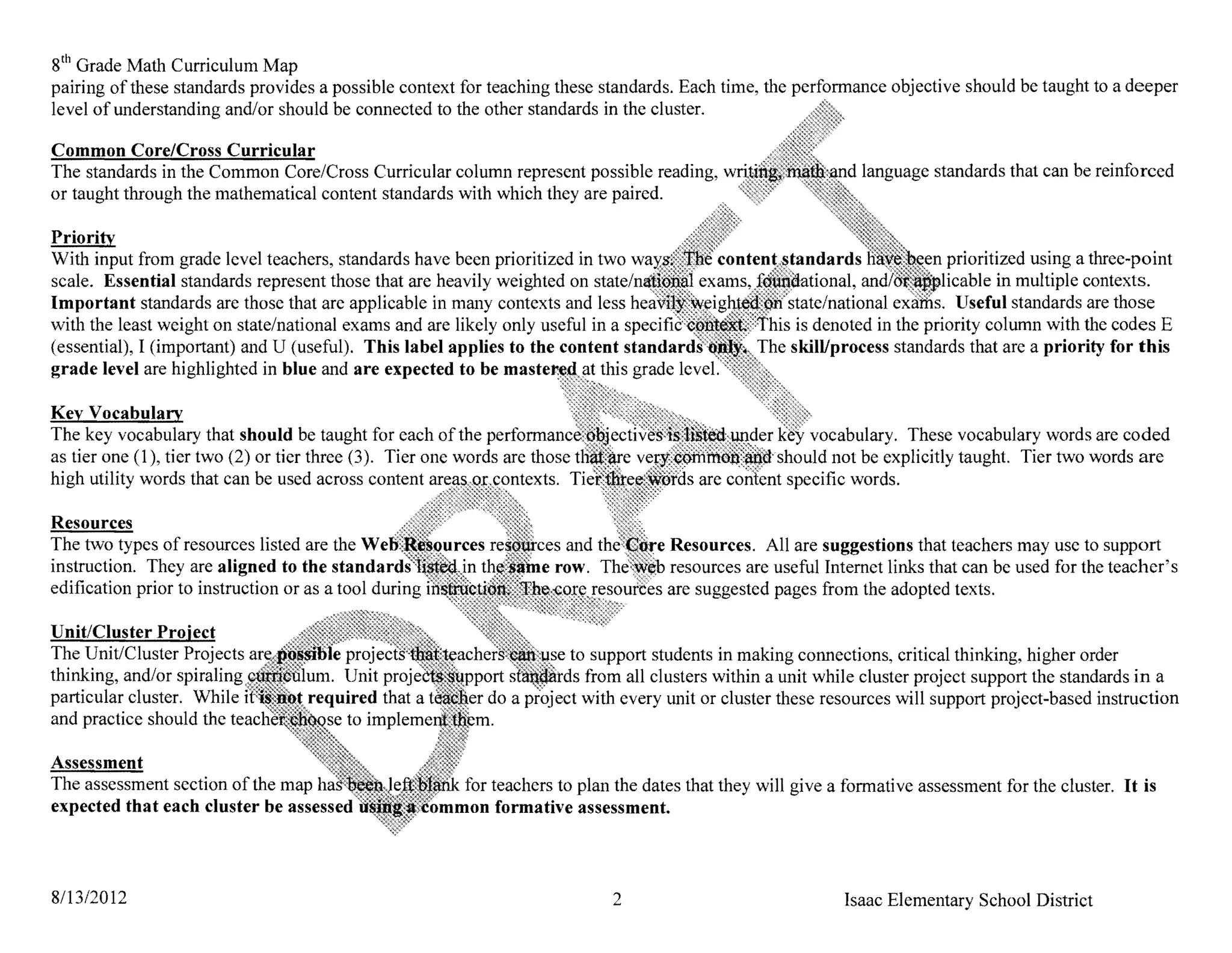 The document provides an 8th grade math curriculum map that outlines the standards, practices, and resources for teaching various math concepts over the school year. It begins with an introduction and overview of how the document is organized. The curriculum is broken into units covering number sense, expressions and equations, and geometry. Each unit contains clusters of related math standards to be taught along with essential questions, key ideas, standards, and suggested resources and assessments. The goal is to provide a logical progression of content knowledge and ensure all teachers follow the same curriculum.