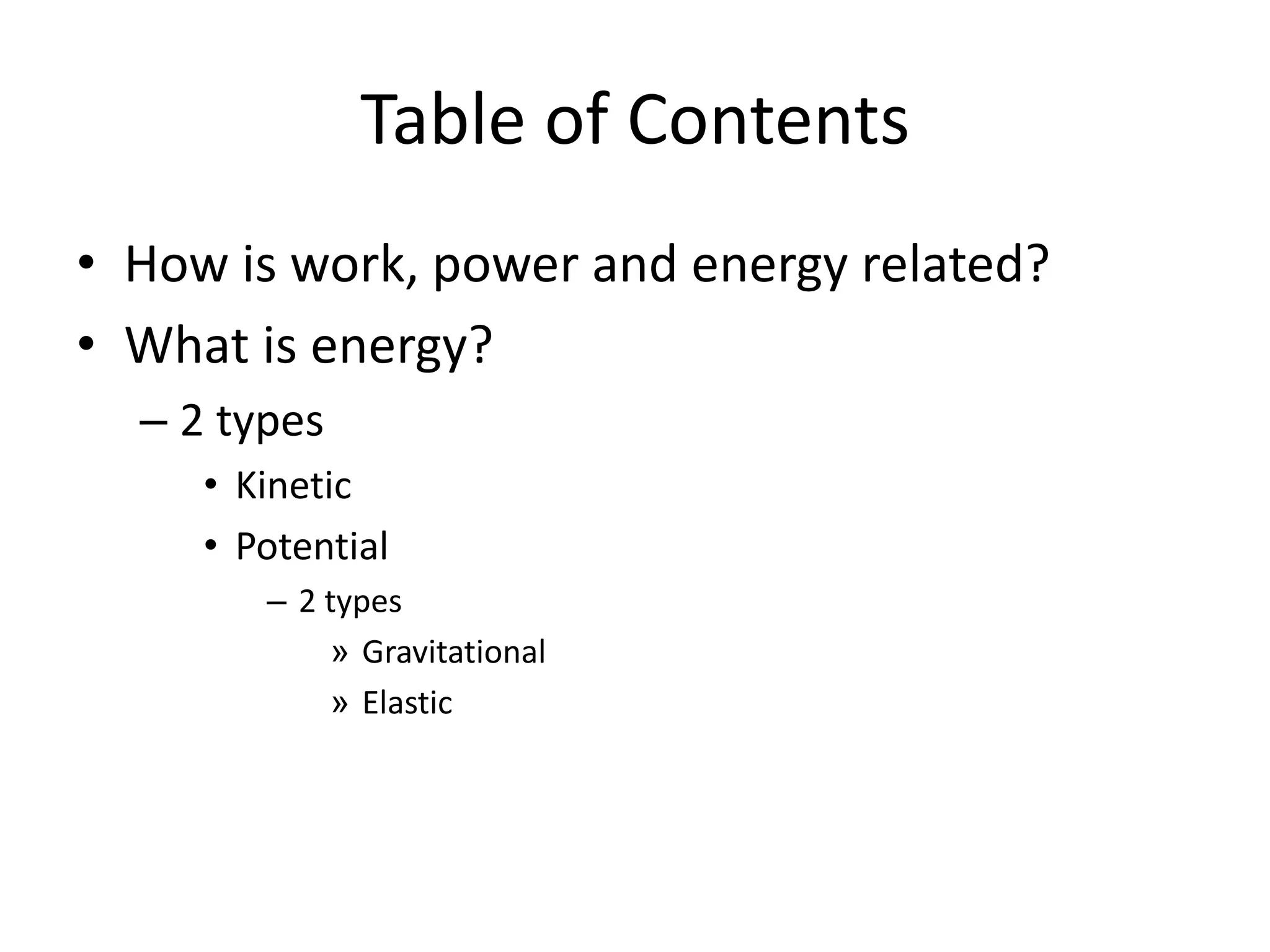The document provides an overview of work, power, and energy, detailing their definitions and relationships, including types of energy such as kinetic, potential, mechanical, thermal, electrical, chemical, nuclear, and electromagnetic. It explains how energy can be defined, measured, and transformed, emphasizing concepts like gravitational and elastic potential energy, as well as the law of conservation of energy. The document illustrates these concepts through examples and calculations related to energy types and their applications.