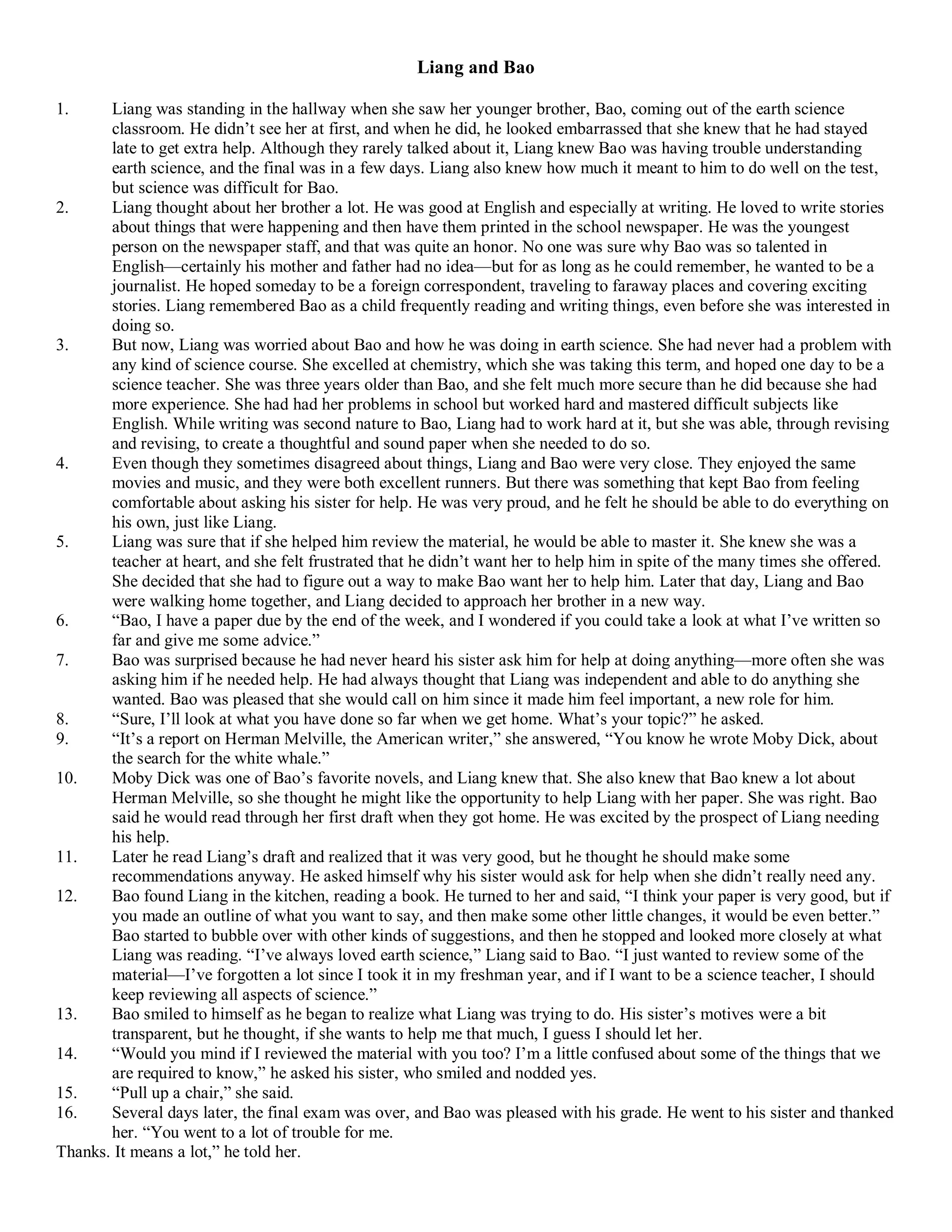 2. Liang and Bao are close, though Bao is talented at writing while Liang excels at science. Liang worries about how Bao is doing in earth science.