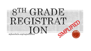 This document provides instructions for student course registration at MJHS. It explains that students have been recommended for specific classes in core subjects like English and Math that must be selected. It outlines the elective options and that two electives and two alternates must be chosen. The registration period is February 6th to 14th with a change window March 6th to 14th and a placement review period March 28th to April 12th. Contact information and events are provided for parents who need additional help with the registration process.