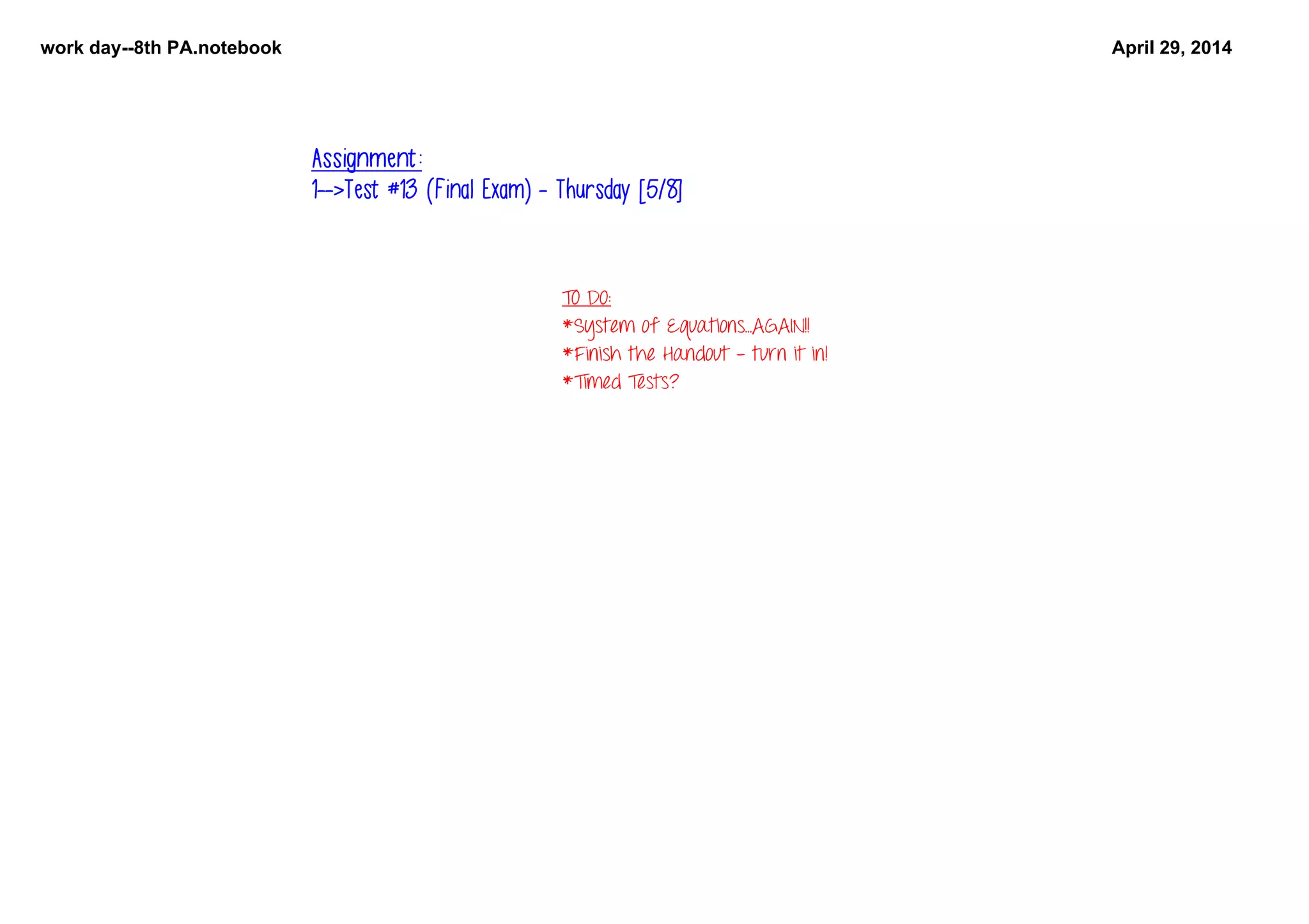 The document contains a to-do list for the day including finishing work on a system of equations, completing a handout to turn in, and considering giving timed tests. It also notes an upcoming final exam is scheduled for Thursday May 8th.