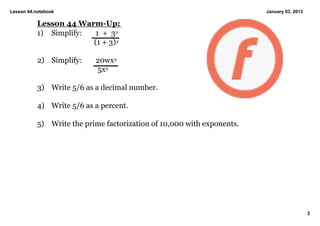 The document outlines an assignment, test dates, and warm-up problems for Lesson 44. It introduces the concepts of cross product and slope. Examples are provided to illustrate calculating cross product and determining slope from points on a line. Students are to complete Set 45 odds problems for homework due on Monday and have a Test #6 on Thursday. They should study flashcards and time themselves on practice tests.