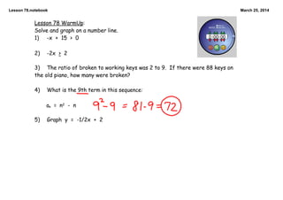 The document contains notes from a math lesson. It lists upcoming assignments, including an even problem set due the next day and a test later in the week. It also includes warm-up problems on solving inequalities, ratios, sequences, and graphing lines. The lesson content discusses multiplying square roots, with examples on simplifying expressions involving square roots.