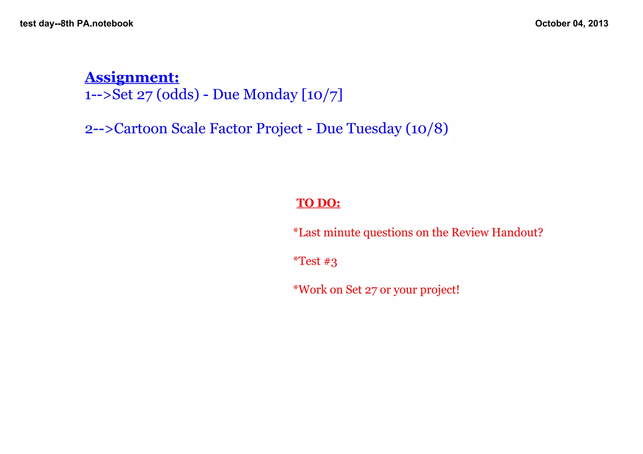 This document provides a to-do list for a test day that includes reviewing last-minute questions, taking Test #3, and working on optional math problems or a cartoon scale factor project. Students have homework assigned including odd problems from Set 27 due Monday and a cartoon scale factor project due Tuesday.