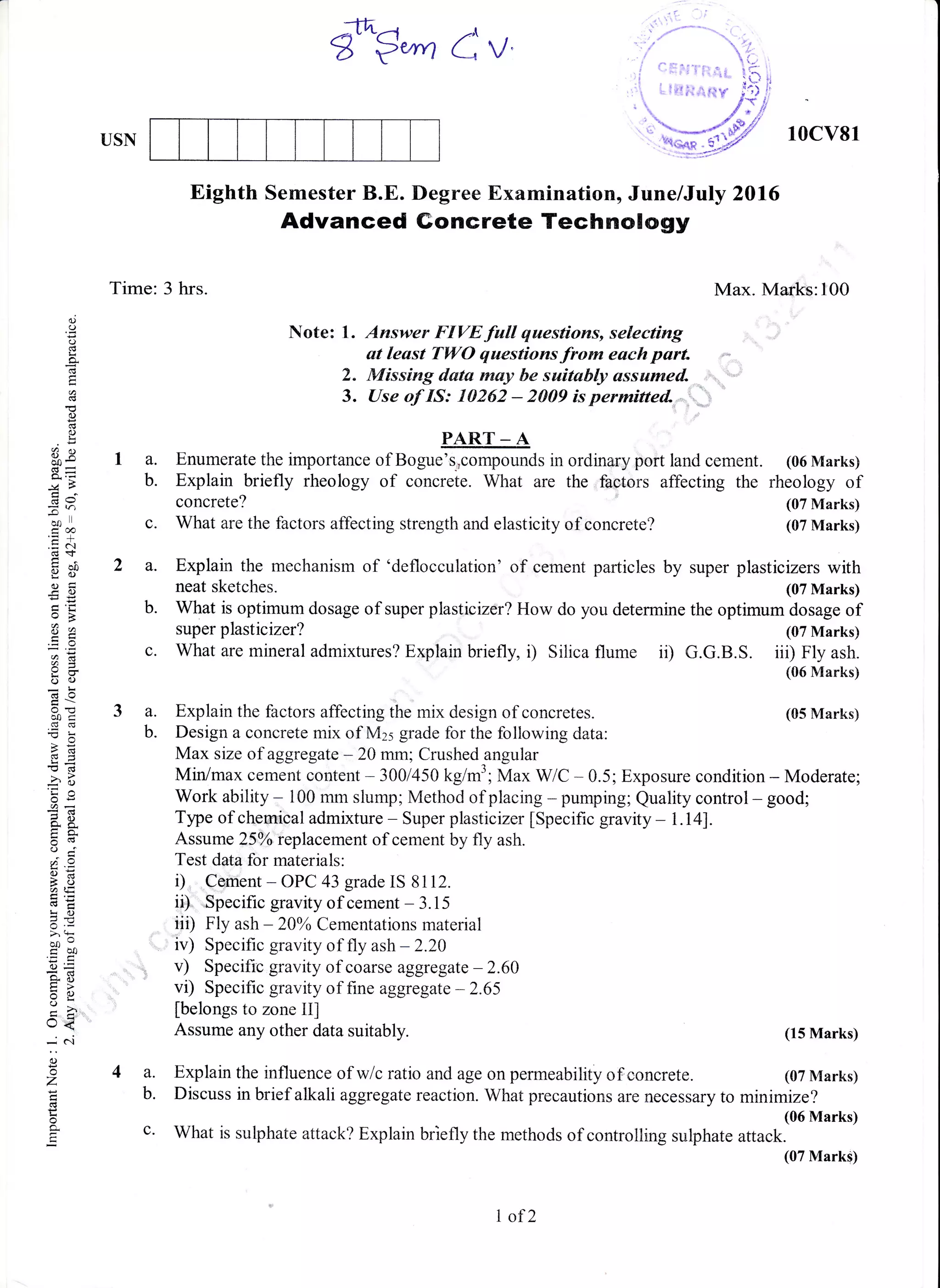 The document discusses various topics related to concrete technology and pavement design. It contains questions regarding factors affecting concrete mix design, designing a concrete mix of M25 grade, alkali aggregate reaction, sulphate attack, types of fibers used in concrete, self-compacting concrete, ferrocement, lightweight and high performance concrete, tests on hardened concrete, and more. It also contains questions related to pavement design strategies, flexible and rigid pavements, Boussinesq's theory, pavement failures, and maintenance of joints in rigid pavements. The document tests knowledge across different aspects of concrete and pavement engineering.