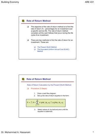 This document discusses methods for calculating the rate of return of an investment using cash flow diagrams and equations. It describes the Present Worth Method and Equivalent Uniform Annual Cost Method for calculating rate of return. An example calculation is shown using both methods to find a 5.16% rate of return for an investment of $5,000 that yields $100 annually for 10 years and $7,000 at the end of 10 years.