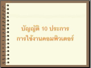 ต้องไม่รบกวนการทางานของผู้อื่น 3. ต้องไม่สอดแนม แก้ไข หรือเปิดดูแฟ้มข้อมูลของผู้อื่น 4. ต้องไม่ใช้คอมพิวเตอร์เพื่อการโจรกรรมข้อมูลข่าวสาร 5. ต้องไม่ใช้คอมพิวเตอร์สร้างหลักฐานที่เป็นเท็จ 6.ต้องไม่คัดลอกโปรแกรมของผู้อื่นที่มีลิขสิทธิ์ 7.ต้องไม่ละเมิดการใช้ทรัพยากรคอมพิวเตอร์โดยที่ตนเองไม่มีสิทธิ์ 8.ต้องไม่นาเอาผลงานของผู้อื่นมาเป็นของตน 9.ต้องคานึงถึงสิ่งที่จะเกิดขึ้นกับสังคมที่เกิดจากการกระทาของท่าน 10.ต้องใช้คอมพิวเตอร์โดยเคารพกฎระเบียบกติกาและมีมารยา