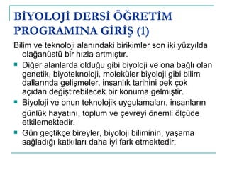 BİYOLOJİ DERSİ ÖĞRETİMPROGRAMINA GİRİŞ (1) Bilim ve teknoloji alanındaki birikimler son iki yüzyılda olağanüstü bir hızla artmıştır. Diğer alanlarda olduğu gibi biyoloji ve ona bağlı olan genetik, biyoteknoloji, moleküler biyoloji gibi bilim dallarında gelişmeler, insanlık tarihini pek çok açıdan değiştirebilecek bir konuma gelmiştir. Biyoloji ve onun teknolojik uygulamaları, insanların günlük hayatını, toplum ve çevreyi önemli ölçüde etkilemektedir. Gün geçtikçe bireyler, biyoloji biliminin, yaşama sağladığı katkıları daha iyi fark etmektedir.