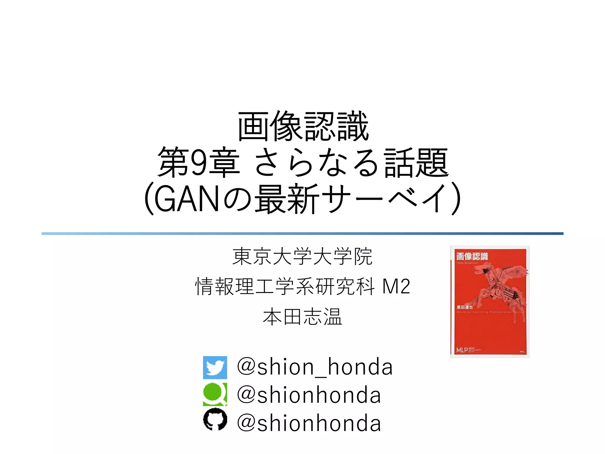 画像認識 第9章 さらなる話題 (GANの最新サーベイ) 東京大学大学院 情報理工学系研究科 M2 本田志温 @shion_honda @shionhonda @shionhonda