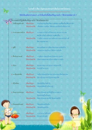 ปั ญหาและความจาเป็ นในการทาโครงงาน ----------------------------------------------------------------------------- ให้ นกเรี ยนคิดหาคาตอบว่า เราทาสิ่งต่อไปนี ้เพื่อแก้ ปัญหาอะไร ? ได้ ประโยชน์อย่างไร ? ั กิจกรรมต่อไปนี ้ปฏิบติเพื่อแก้ ปัญหาอะไร ? ได้ ประโยชน์อย่างไร ? ั 1. ไปเที่ยวศูนย์การค้ า เพื่อแก้ ปัญหา การเกิดความเครียด ต้ องการพักผ่อน และซื ้อเครื่ องใช้ ประจาตัว ได้ ประโยชน์ คือ เพื่อขจัดความเครี ยด ได้ พกผ่อนและได้ เครื่ องใช้ ประจาตัว ั 2. ทาความสะอาดบ้ าน เพื่อแก้ ปัญหา ความสกปรกในบ้ านที่เกิดจากฝุ่ น คราบอาหาร และ ของใช้ ภายในบ้ านทีสกปรก ขนสัตว์เลี ้ยง ่ ได้ ประโยชน์ คือ บ้ านมีความสะอาด สุขภาพจิตและกายของคนในบ้ านดี มีความสุข สบายตา 3. ดูทีวี เพื่อแก้ ปัญหา ความเครี ยดจากการเรี ยน ต้ องการความบันเทิงใจ ได้ ประโยชน์ คือ ผ่อนคลายอารมณ์ สนุก ได้ รับความบันเทิง 4. ซื ้อจักรยานยนต์ เพื่อแก้ ปัญหา การเดินทางโดยรถโดยสารไม่สะดวก รวดเร็ว ได้ ประโยชน์ คือ เกิดความสะดวกสบายในการเดินทาง รวดเร็ ว 5. ทานา เพื่อแก้ ปัญหา ความยากจน การว่างงาน การขาดรายได้ ได้ ประโยชน์ คือ มีรายได้ ไม่วางงาน ่ 6. มาเรียนหนังสือ เพื่อแก้ ปัญหา ไม่มีความรู้และทักษะในการประกอบอาชีพในอนาคต ได้ ประโยชน์ คือ มีความรู้ สามารถนาไปประกอบอาชีพ 7. ตังใจเรี ยน ้ เพื่อแก้ ปัญหา เรี ยนไม่ร้ ูเรื่ อง ไม่เข้ าใจ ได้ ประโยชน์ คือ เรี ยนหนังสือเข้ าใจ มีความรู้ 8. เรี ยนภาษาอังกฤษ เพื่อแก้ ปัญหา สือสารกับคนต่างชาติไม่ร้ ูเรื่ อง ยากต่อการ ่ ใช้ เทคโนโลยีในปั จจุบน ั ได้ ประโยชน์ คือ สือสารกับคนต่างชาติได้ ใช้ เทคโนโลยีได้ ่ 9. เรี ยนคอมพิวเตอร์ เพื่อแก้ ปัญหา ใช้ คอมพิวเตอร์ ไม่เป็ น ได้ ประโยชน์ คือ ใช้ คอมพิวเตอร์ เป็ น 10. สมัครงาน เพื่อแก้ ปัญหา การว่างงาน ไม่มีรายได้ ได้ ประโยชน์ คือ มีงานทา มีรายได้