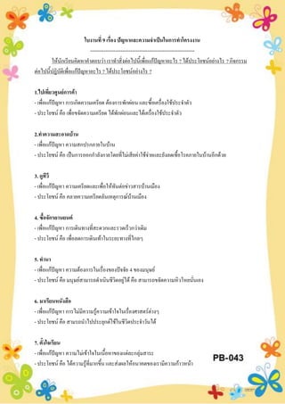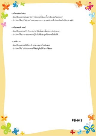 āļāļąāļāļŦāļēāđāļĨāļ°āļāļ§āļēāļĄāļāļēāđāļāđāļāđāļāļāļēāļĢāļāļēāđāļāļĢāļāļāļēāļ -------------------------------------------------------------- āđāļŦāđāļāļąāļāđāļĢāļĩāļĒāļāļāļīāļāļŦāļēāļāļēāļāļāļāļ§āđāļē āđāļĢāļēāļāļēāļŠāļīāđāļāļāđāļāđāļāļāļĩāđāđāļāļ·āđāļāđāļāđāļāļąāļāļŦāļēāļāļ°āđāļĢ ? āđāļāđāļāļĢāļ°āđāļĒāļāļāđāļāļĒāđāļēāļāđāļĢ ? āļāļīāļāļāļĢāļĢāļĄ āļāđāļāđāļāļāļĩāđāļāļāļīāļāļąāļāļīāđāļāļ·āđāļāđāļāđāļāļąāļāļŦāļēāļāļ°āđāļĢ ? āđāļāđāļāļĢāļ°āđāļĒāļāļāđāļāļĒāđāļēāļāđāļĢ ? 1.āđāļāđāļāļĩāđāļĒāļ§āļĻāļđāļāļĒāđāļāļēāļĢāļāđāļē - āđāļāļ·āđāļāđāļāđāļāļąāļāļŦāļē āļāļēāļĢāđāļāļīāļāļāļ§āļēāļĄāđāļāļĢāļĩāļĒāļ āļāđāļāļāļāļēāļĢāļāļąāļāļāđāļāļ āđāļĨāļ°āļāļ·āđāļāđāļāļĢāļ·āđāļāļāđāļāđāļāļĢāļ°āļāļēāļāļąāļ§ - āļāļĢāļ°āđāļĒāļāļāđ āļāļ·āļ āđāļāļ·āđāļāļāļāļąāļāļāļ§āļēāļĄāđāļāļĢāļĩāļĒāļ āđāļāđāļāļąāļāļāđāļāļāđāļĨāļ°āđāļāđāđāļāļĢāļ·āđāļāļāđāļāđāļāļĢāļ°āļāļēāļāļąāļ§ 2.āļāļēāļāļ§āļēāļĄāļŠāļ°āļāļēāļāļāđāļēāļ - āđāļāļ·āđāļāđāļāđāļāļąāļāļŦāļē āļāļ§āļēāļĄāļŠāļāļāļĢāļāļ āļēāļĒāđāļāļāđāļēāļ - āļāļĢāļ°āđāļĒāļāļāđ āļāļ·āļ āđāļāđāļāļāļēāļĢāļāļāļāļāļēāļĨāļąāļāļāļēāļĒāđāļāļĒāļāļĩāđāđāļĄāđāđāļŠāļĩāļĒāļāđāļēāđāļāđāļāđāļēāļĒāđāļĨāļ°āļĒāļąāļāļĨāļāđāļāļ·āđāļāđāļĢāļāļ āļēāļĒāđāļāļāđāļēāļāļāļĩāļāļāđāļ§āļĒ 3. āļāļđāļāļĩāļ§āļĩ - āđāļāļ·āđāļāđāļāđāļāļąāļāļŦāļē āļāļ§āļēāļĄāđāļāļĢāļĩāļĒāļāđāļĨāļ°āđāļāļ·āđāļāđāļŦāđāļāļąāļāļāđāļāļāđāļēāļ§āļŠāļēāļĢāļāđāļēāļāđāļĄāļ·āļāļ - āļāļĢāļ°āđāļĒāļāļāđ āļāļ·āļ āļāļĨāļēāļĒāļāļ§āļēāļĄāđāļāļĢāļĩāļĒāļāļĨāļąāļāđāļŦāļāļļāļāļēāļĢāļāđāļāđāļēāļāđāļĄāļ·āļāļ 4. āļāļ·āđāļāļāļąāļāļĢāļĒāļēāļāļĒāļāļāđ - āđāļāļ·āđāļāđāļāđāļāļąāļāļŦāļē āļāļēāļĢāđāļāļīāļāļāļēāļāļāļĩāđāļŠāļ°āļāļ§āļāđāļĨāļ°āļĢāļ§āļāđāļĢāđāļ§āļāļ§āđāļēāđāļāļīāļĄ - āļāļĢāļ°āđāļĒāļāļāđ āļāļ·āļ āđāļāļ·āđāļāļĨāļāļāļēāļĢāđāļāļīāļāđāļāđāļēāđāļāļĢāļ°āļĒāļ°āļāļēāļāļāļĩāđāđāļāļĨāđ 5. āļāļēāļāļē - āđāļāļ·āđāļāđāļāđāļāļąāļāļŦāļē āļāļ§āļēāļĄāļāđāļāļāļāļēāļĢāđāļāđāļĢāļ·āđāļāļāļāļāļāļāļąāļāļāļąāļĒ 4 āļāļāļāļĄāļāļļāļĐāļĒāđ - āļāļĢāļ°āđāļĒāļāļāđ āļāļ·āļ āļĄāļāļļāļĐāļĒāđāļŠāļēāļĄāļēāļĢāļāļāļēāđāļāļīāļāļāļĩāļ§āļīāļāļāļĒāļđāđāđāļāđ āļāļ·āļ āļŠāļēāļĄāļēāļĢāļāļāļāļąāļāļāļ§āļēāļĄāļŦāļīāļ§āđāļŦāļĒāļāļąāđāļāđāļāļ 6. āļĄāļēāđāļĢāļĩāļĒāļāļŦāļāļąāļāļŠāļ·āļ - āđāļāļ·āđāļāđāļāđāļāļąāļāļŦāļē āļāļēāļĢāđāļĄāđāļĄāļĩāļāļ§āļēāļĄāļĢāļđāđāļāļ§āļēāļĄāđāļāđāļēāđāļāđāļāđāļĢāļ·āđāļāļāļĻāļēāļŠāļāļĢāđāļāđāļēāļāđ - āļāļĢāļ°āđāļĒāļāļāđ āļāļ·āļ āļŠāļēāļĄāļĢāļāļāļēāđāļāļāļĢāļ°āļĒāļļāļāļāđāđāļāđāđāļāļāļĩāļ§āļīāļāļāļĢāļ°āļāļēāļ§āļąāļāđāļāđ 7. āļāļąāđāļāđāļāđāļĢāļĩāļĒāļ - āđāļāļ·āđāļāđāļāđāļāļąāļāļŦāļē āļāļ§āļēāļĄāđāļĄāđāđāļāđāļēāđāļāđāļāđāļāļ·āđāļāļŦāļēāļāļāļāđāļāđāļĨāļ°āļāļĨāļļāđāļĄāļŠāļēāļĢāļ° - āļāļĢāļ°āđāļĒāļāļāđ āļāļ·āļ āđāļāđāļāļ§āļēāļĄāļĢāļđāđāļāļĩāđāļĄāļēāļāļāļķāđāļ āđāļĨāļ°āļŠāđāļāļāļĨāđāļŦāđāļāļāļēāļāļāļāļāļāđāļĢāļēāļĄāļĩāļāļ§āļēāļĄāļāđāļēāļ§āļŦāļāđāļē