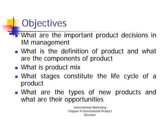 Chapter 9 focuses on international product decisions in marketing, including product strategy, branding, packaging, and the product life cycle. Key concepts discussed are the types of products, new product development processes, and the differences between globalization and localization in branding. The chapter also highlights the importance of adapting product communications and strategies to different markets while considering the business environment.