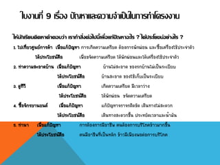 ปัญหาและความจาเป็นในการทาโครงงาน ให้นักเรียนคิดหาคาตอบว่า เราทาสิ่งต่อไปนี้เพื่อแก้ปัญหาอะไร ? ได้ประโยชน์อย่างไร ? 1. ไปเที่ยวศูนย์การค้า เพื่อแก้ปัญหา การเกิดความเครียด ต้องการพักผ่อน และซื้อเครื่องใช้ประจาตัว ได้ประโยชน์คือ เพื่อขจัดความเครียด ได้พักผ่อนและได้เครื่องใช้ประจาตัว 2. ทาความสะอาดบ้าน เพื่อแก้ปัญหา บ้านไม่สะอาด ของรกบ้านไม่เป็นระเบียบ ได้ประโยชน์คือ บ้านสะอาด ของใช้เก็บเป็นระเบียบ 3. ดูทีวี เพื่อแก้ปัญหา เกิดความเครียด มีเวลาว่าง ได้ประโยชน์คือ ได้พักผ่อน ขจัดความเครียด 4. ซื้อจักรยานยนต์ เพื่อแก้ปัญหา แก้ปัญหาจราจรติดขัด เดินทางไม่สะดวก ได้ประโยชน์คือ เดินทางสะดวกขึ้น ประหยัดเวลาและน้ามัน 5. ทานา เพื่อแก้ปัญหา การต้องการมีอาชีพ คนต้องการบริโภคข้าวมากขึ้น ได้ประโยชน์คือ คนมีอาชีพที่เป็นหลัก ข้าวมีเพียงพอต่อการบริโภค