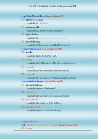 คิดวิเคราะห์สร้างทางเลือก และเกณฑ์ที่ใช้ 1. ปลูกไม้ดอกไม้ประดับที่บ้าน (ต้องตอบให้ครบทุกวิธี) วิธีที่ 1 ปลูกในกระถางดินเผา เกณฑ์ที่เลือกใช้ ... พื้นที่มีจากัด ... วิธีที่ 2 ปลูกในกระบะไม้ เกณฑ์ที่เลือกใช้ ...เป็นไม้ที่สามารถปลูกในกระบะได้ วิธีที่ 3 ปลูกในร่องสวน เกณฑ์ที่เลือกใช้ ............................................................... วิธีที่ 4 ปลูกพื้นที่ข้างบ้าน เกณฑ์ที่เลือกใช้ ให้ความสวยงามและใช้พื้นที่ให้เป็นประโยชน์ 2. เก็บอาหารให้อยู่ได้นาน ๆ (ต้องตอบให้ครบทุกวิธี) วิธีที่ 1 ดองเค็ม เกณฑ์ที่เลือกใช้ เลือกวัตถุดิบที่ให้ความเค็ม วิธีที่ 2 การกวน เกณฑ์ที่เลือกใช้ เป็นวิธีที่ถนอมอาหารได้นานโดยการนาผลไม้มากวน วิธีที่ 3 การรมควัน เกณฑ์ที่เลือกใช้ การทาให้อาหารสุกและหอมกลิ่นการรมควัน วิธีที่ 4 การตากแห้ง เกณฑ์ที่เลือกใช้ การนาของสดมาตากให้แห้งและเป็นวิธีที่ประหยัดที่สุด 3. ตกแต่งห้องเรียนให้สวยงาม (ต้องตอบให้ครบทุกวิธี) วิธีที่ 1 บริเวณหน้าห้องเรียน เกณฑ์ที่เลือกใช้ จัดตกแต่งโต๊ะด้วยดอกไม้ วิธีที่ 2 บริเวณหน้าต่าง เกณฑ์ที่เลือกใช้ นาโมบายมาห้อยหรือกระดิ่งเล็กให้เกิดเสียง วิธีที่ 3 บริเวณโต๊ะ เก้าอี้ เกณฑ์ที่เลือกใช้ สารวจโต๊ะและเก้าอี้ว่าไม่มีชารุด วิธีที่ 4 บริเวณชั้นวางรองเท้า เกณฑ์ที่เลือกใช้ รองเท้าวางเป็นระเบียบเรียบร้อย 4. กิจกรรมนันทนาการ (ข้อนี้ ให้นักเรียนกาหนดกิจกรรมเอง 1 กิจกรรม ต้องตอบให้ครบทุกวิธี ) วิธีที่ 1 ร้องเพลง
