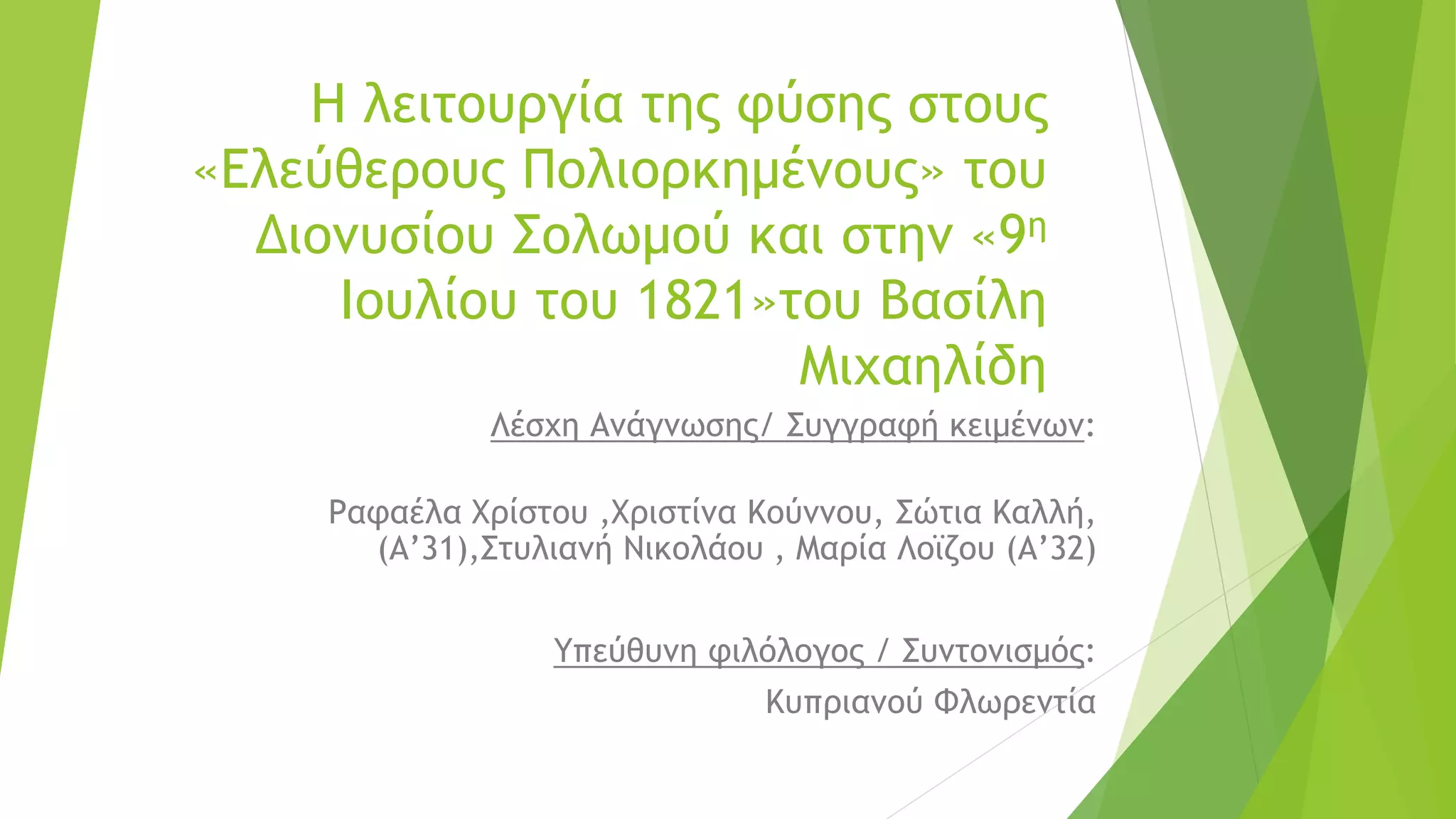 Η λειτουργία της Φύσης στην 9η Ιουλίου του 1821 ( Βασίλης Μιχαηλίδης) και τους Ελεύθερους Πολιορκημένους ( Διονύσιος Σολωμός)