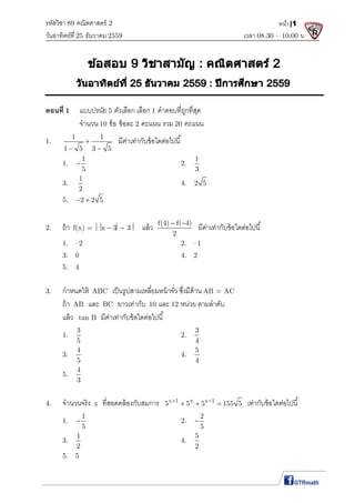 2 วันอาทิตย์ที 25 ธันวาคม 2559 เวลา 08.30 – 10.00 น. หน้า|1 ตอนที 1 แบบปรนัย 5 ตัวเลือก เลือก 1 คําตอบทีถูกทีสุด จํานวน 10 ข้อ ข้อละ 2 คะแนน รวม 20 คะแนน 1. 1 1 1 5 3 5 มีค่าเท่ากับข้อใดต่อไปนี 1. 1 5 2. 1 3 3. 1 2 4. 2 5 5. 2 2 5 2. ถ้า f(x) = x 3 3 แล้ว f(4) f( 4) 2 มีค่าเท่ากับข้อใดต่อไปนี 1. –2 2. –1 3. 0 4. 2 5. 4 3. กําหนดให้ ABC เป็นรูปสามเหลียมหน้าจัว ซึงมีด้าน AB = AC ถ้า AB และ BC ยาวเท่ากับ 10 และ 12 หน่วย ตามลําดับ แล้ว tan B มีค่าเท่ากับข้อใดต่อไปนี 1. 3 5 2. 3 4 3. 4 5 4. 5 4 5. 4 3 4. จํานวนจริง x ทีสอดคล้องกับสมการ x 1 x x 1 5 5 5 155 5 เท่ากับข้อใดต่อไปนี 1. 1 5 2. 2 5 3. 1 2 4. 5 2 5. 5