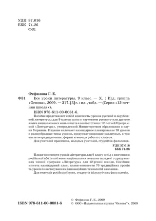 Документ представляет собой пособие по литературе для 9 класса, включающее конспекты уроков русской и зарубежной литературы в соответствии с 12-летней учебной программой Украины. Издание содержит календарное планирование 70 уроков и разнообразные методические рекомендации для учителей и студентов-филологов. Оно охватывает широкий спектр тем, включая античную литературу, классицизм, романтизм и произведения известных авторов.