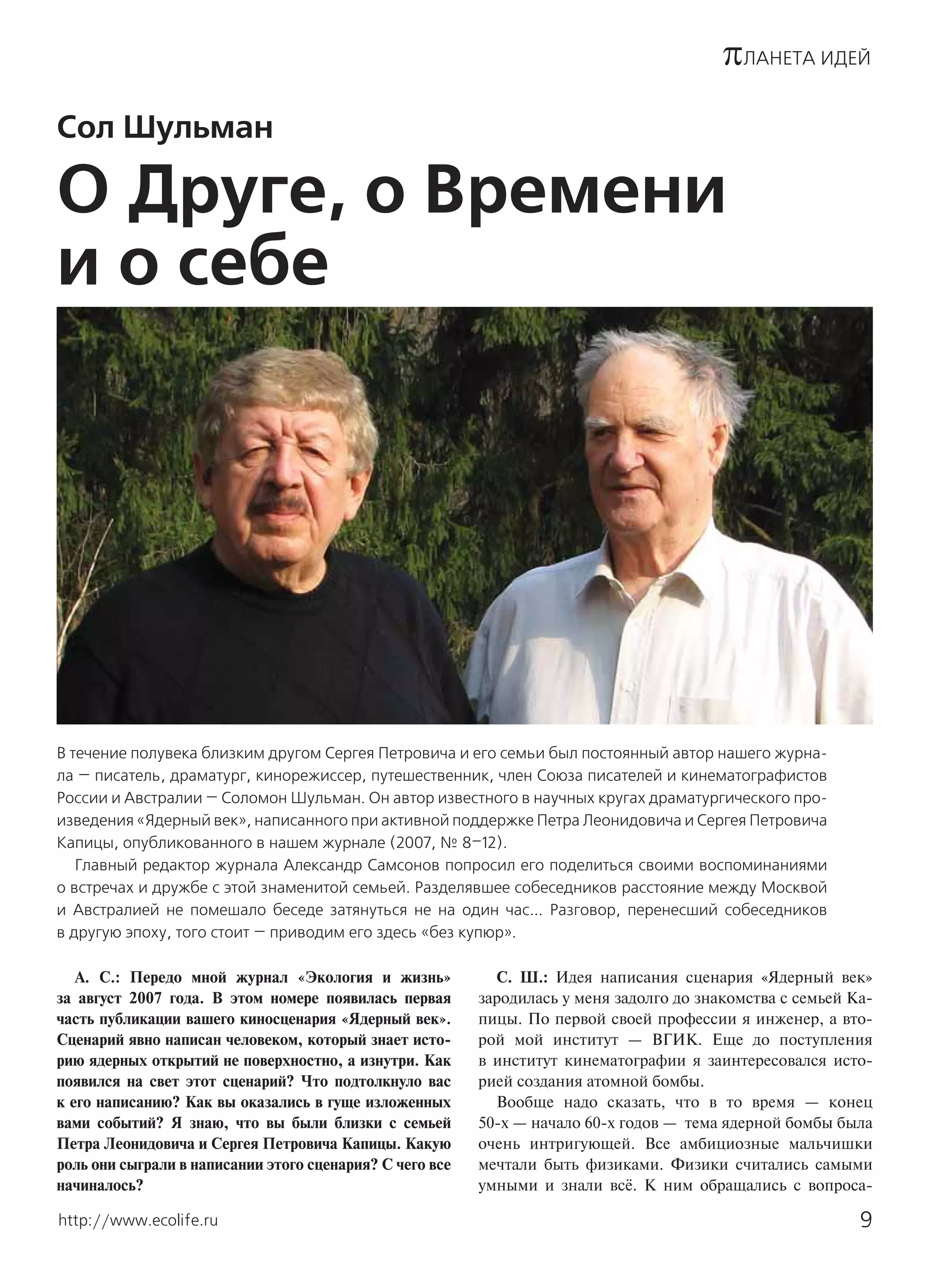 В документе обсуждается процесс написания сценария «Ядерный век» Соломона Шульмана, который начался за много лет до его знакомства с семьей Капицы, и подчеркивается, что вдохновением для работы послужила книга Роберта Юнга. Шульман делится воспоминаниями о своих встречах с известными физиками и о том, как их дружба и знания помогли создать более глубокое произведение о ядерной тематике. Кроме того, он описывает свою карьеру в кино и значимость друзей и семьи Капицы для истории его сценария.