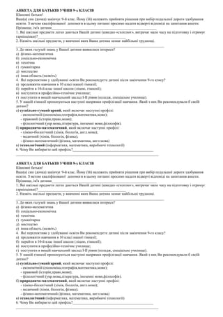 АНКЕТА ДЛЯ БАТЬКІВУЧНІВ 9-х КЛАСІВ