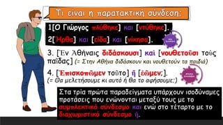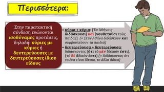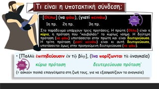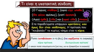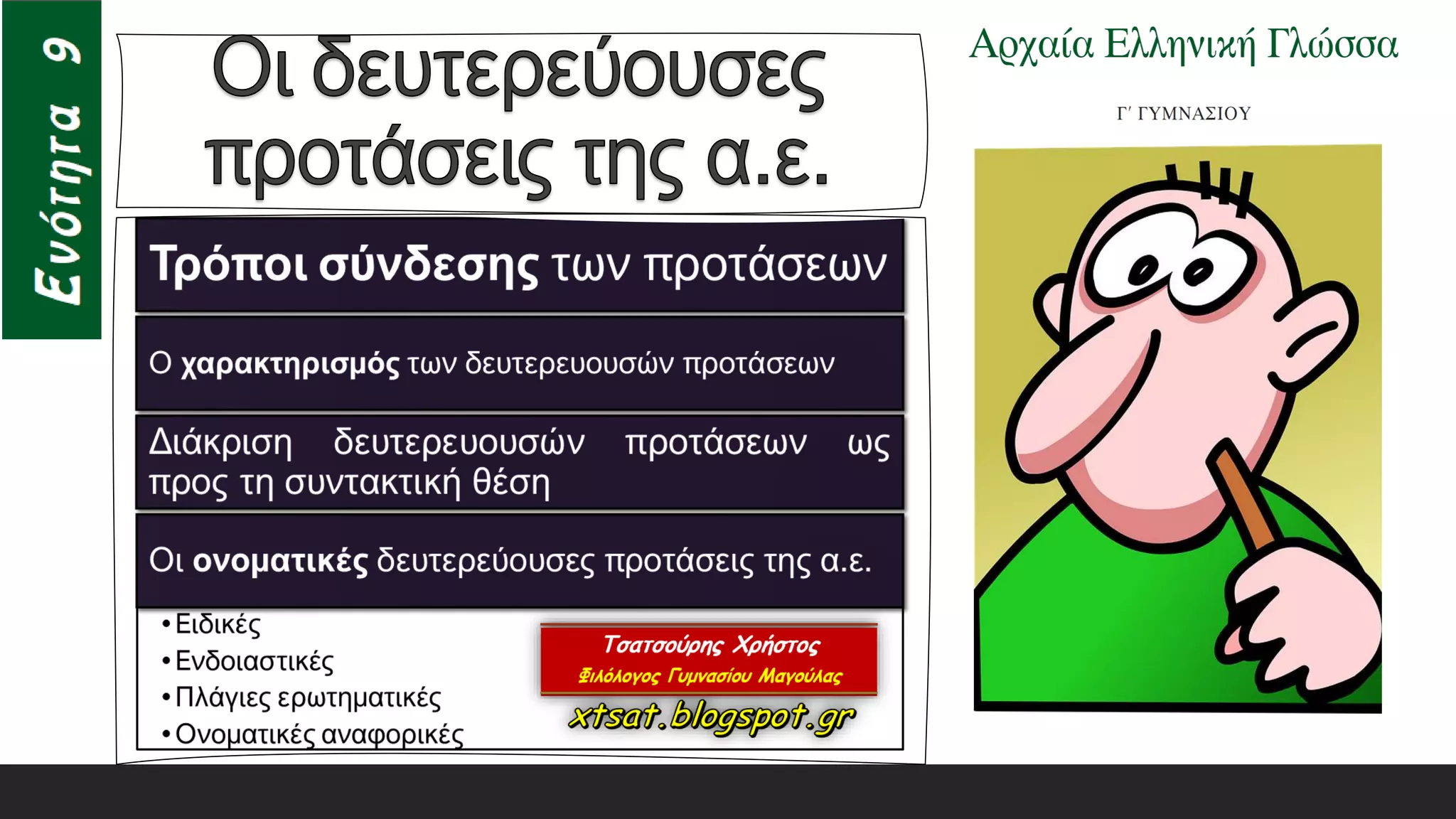Ενότητα 9. Οι δευτερεύουσες προτάσεις της Αρχαίας Ελληνικής. Τρόποι σύνδεσης των προτάσεων. Ο χαρακτηρισμός των δευτερευουσών προτάσεων. Οι ονοματικές δευτερεύουσες προτάσεις της α.ε. Αρχαία Ελληνική Γλώσσα Γ΄ Γυμνασίου, σελ. 75 -78