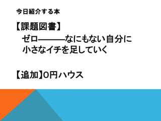 今日紹介する本 【課題図書】 ゼロ―――なにもない自分に 小さなイチを足していく 【追加】0円ハウス