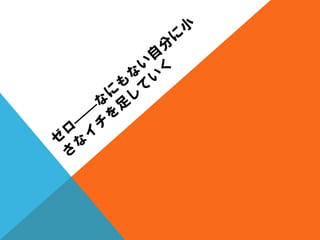 書いてあること/書いてないこと 書いてあること 書いてないこと 刑務所での話 刑務所の外の話 辛い境遇・悲しい思い出 楽しい思い出・うれしかったこと チャンスは平等 根拠 「時間」をお金に代えてお金を「もらう」 のではなくお金を「稼ぐ」仕事をしよう どうしたら「稼ぐ」ことができるか やりがいは「見つける」 のではなく 「つくる」ものだ 作ったらどうするか 20人に1人は経営者 自分で起業した人の割合 お金は信用の積み上げ 信用の最初は自分への信用 で? 仲間の大切さ 仲間をどうやって作ったか いろんな質問を受けているよ どうやって答えているか 宇宙を目指すわけを書くよ 宇宙を目指すわけ