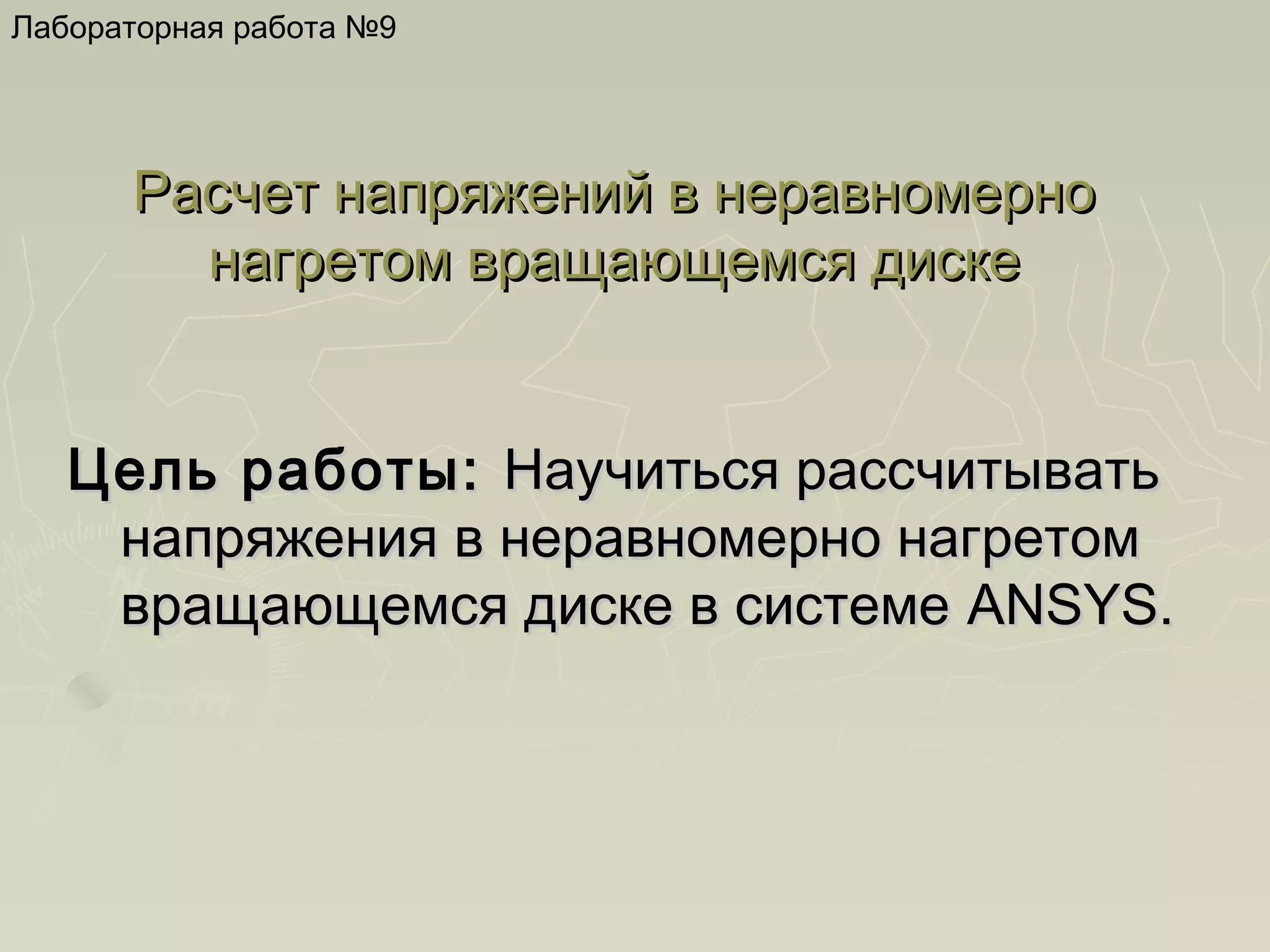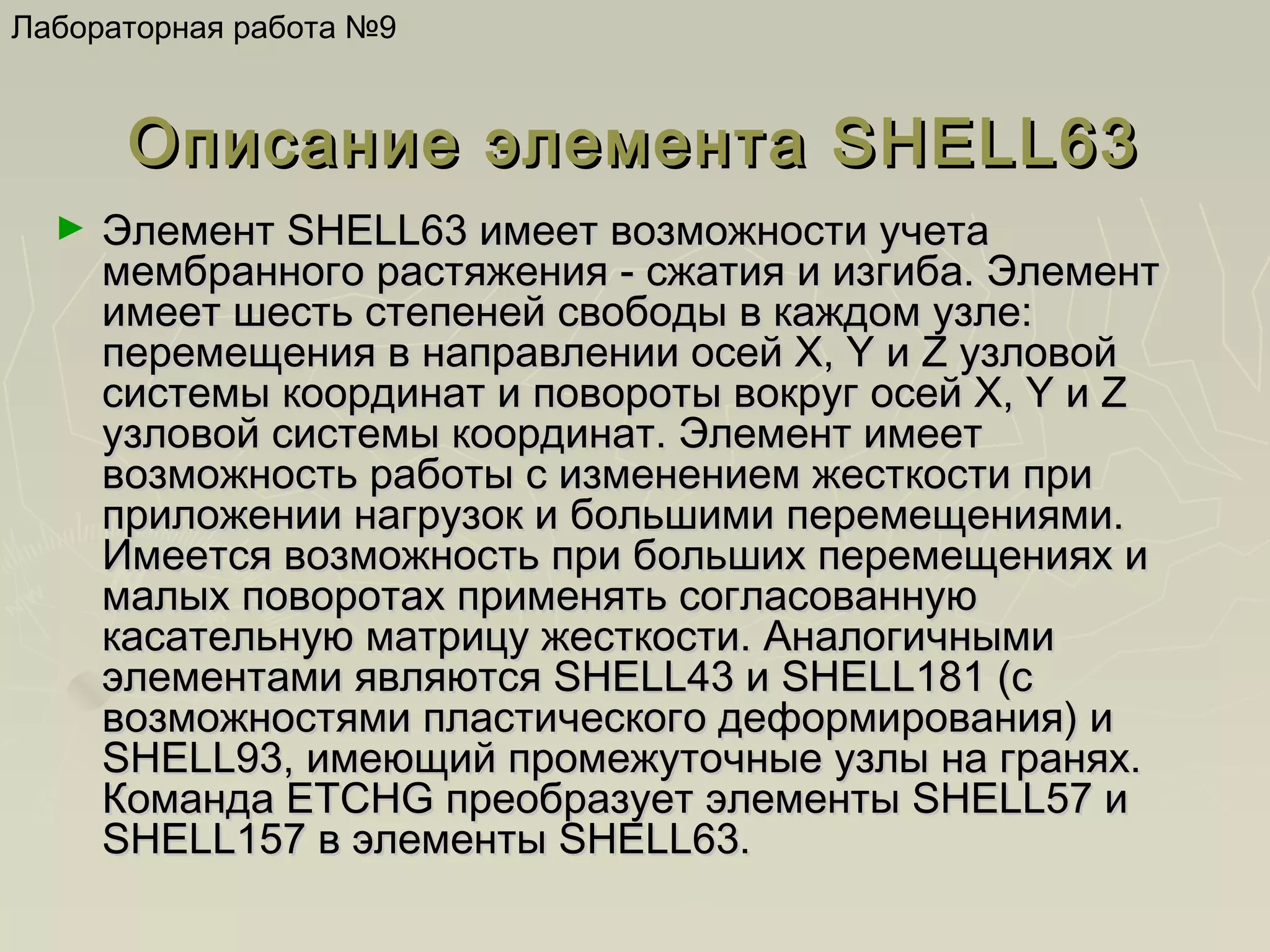Лабораторная работа no9 посвящена расчету напряжений в неравномерно нагретом вращающемся диске с использованием системы ansys, акцентируя внимание на элементе shell63 и его характеристиках. Документ описывает различные системы координат, используемые в ansys, включая глобальные и локальные, а также порядок выполнения лабораторной работы и содержание отчета. В заключение представлены контрольные вопросы для закрепления материала.
