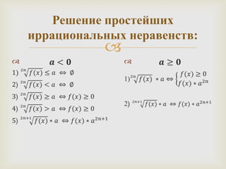 Документ посвящен решению простейших иррациональных неравенств. В нем приведены основные теоремы и примеры, иллюстрирующие тему. Также указано домашнее задание для практики.