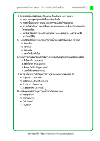 ระบบต่อมไร้ท่อกับฮอร์โมน ชั้นมัธยมศึกษาปีที่ 5 ชุดการสอนที่ 9 เรื่อง ฮอร์โมนกับการรักษาดุลยภาพในร่างกาย 3 6. ข้อใดต่อไปนี้แสดงให้เห็นถึง Negative feedback mechanism ก. กระบวนการดูดกลุโคสกลับคืนของท่อหน่วยไต ข. การขับน้ามันออกทางผิวหนังเพื่อลดการสูญเสียน้าทางผิวหนัง ค. ความสัมพันธ์ระหว่างต่อมใต้สมอง ต่อมไทรอยด์ และระดับฮอร์โมนไทรอกซิน ในกระแสเลือด ง. ซากสิ่งมีชีวิตเกิดการย่อยสลายเป็นสารประกอบที่พืชสามารถนากลับมาใช้ ประโยชน์ได้อีก 7. โครงสร้างที่ใช้ในการรักษาดุลยภาพของน้าและแร่ธาตุในสัตว์บก คือข้อใด ก. ต่อมเกลือ ข. หน่วยไต ค. ต่อมนาซัล ง. แทรกไทล์ แวคิวโอล 8. ระดับความเข้มข้นเกลือแร่ภายในร่างกายให้ใกล้เคียงกับสภาพแวดล้อม คือข้อใด ก. ไอโซทอนิก (isotonic) ข. ไฮโพโทนิก (hypotonic) ค. ไฮเพอร์โทนิก (hypertonic) ง. เมตาโทนิด (Mata tonic) 9. ฮอร์โมนที่มีบทบาทสาคัญในการควบคุมระดับแคลเซียมในเลือด คือ ก. Thyroxin , Glucagon ข. Calcitonin , Parathormone ค. Prolactin , Oxytocin ง. Aldosterone , Cortisol 10. ฮอร์โมนกลุ่มใดควบคุมการดูดน้ากลับคืนท่อหน่วยไต ก. Vasopressin ข. Epinephrine ค. Calcitonin' ง. Thyroxin