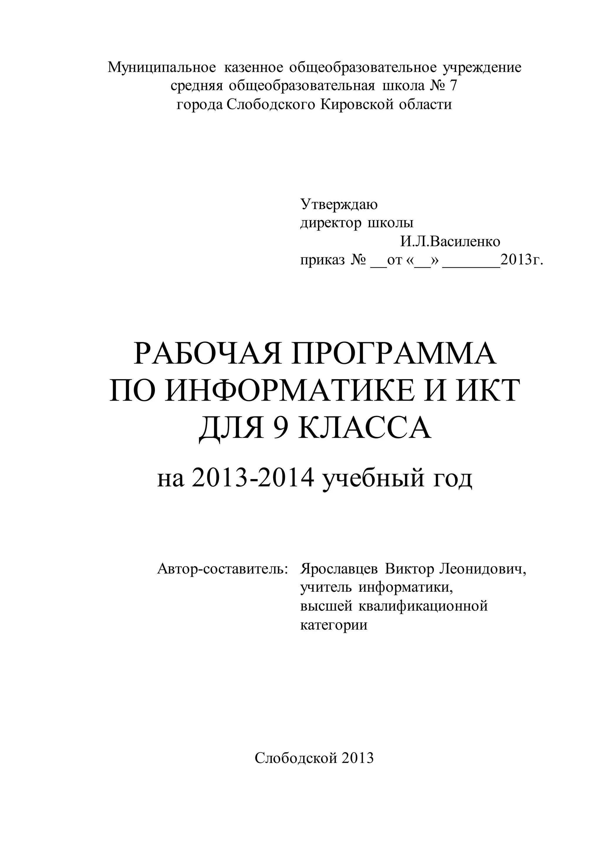 Документ представляет рабочую программу по информатике и информационно-коммуникационным технологиям для 9 класса, утвержденную директором школы. Программа охватывает изучение информатики в течение 68 учебных часов и включает теоретические и практические аспекты, направленные на развитие умений обрабатывать информацию. Цели программы включают формирование знаний о информационных процессах, умение работать с данными, а также развитие критического мышления и этического подхода к информации.
