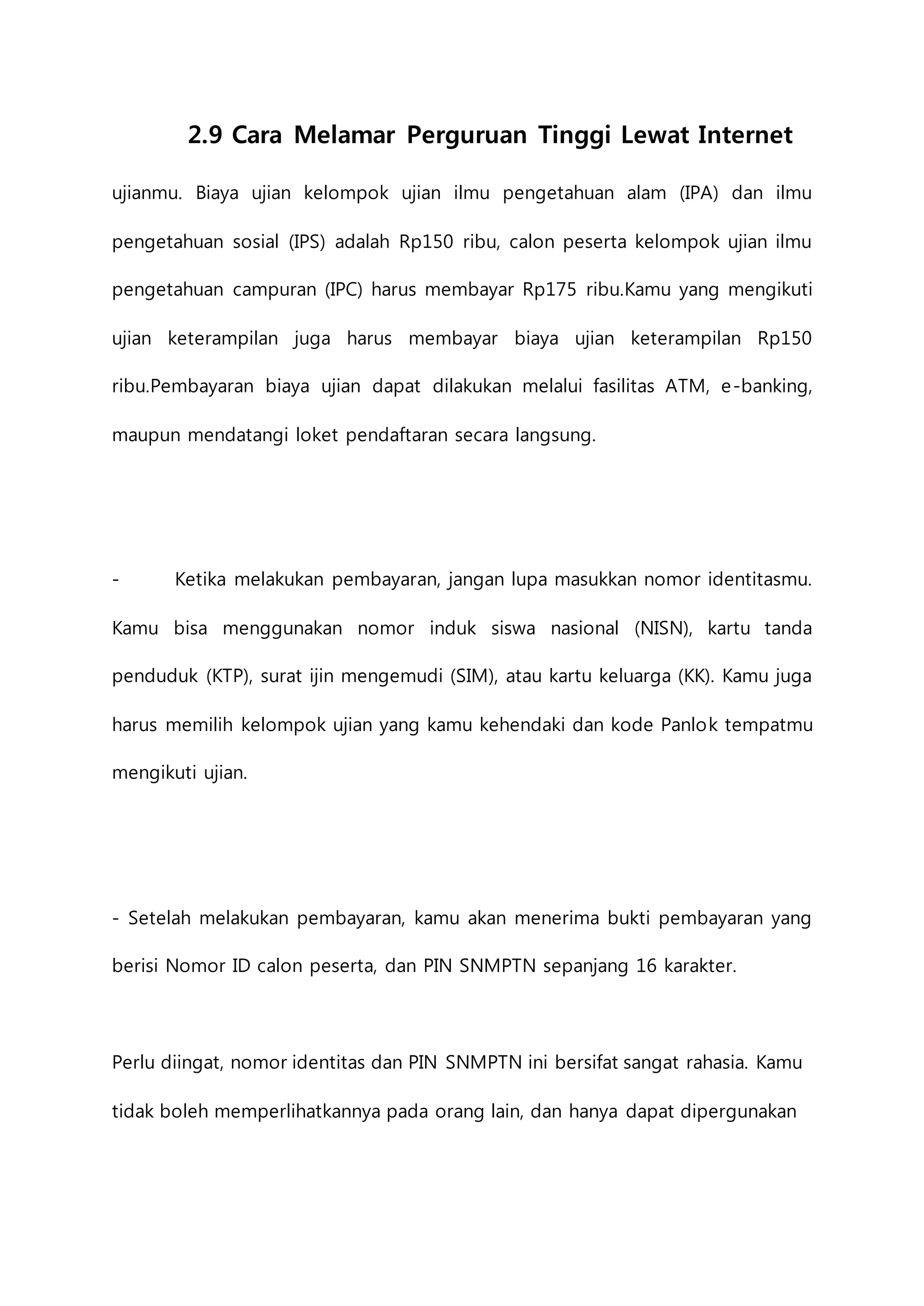 Dokumen ini menjelaskan proses melamar perguruan tinggi secara online, termasuk biaya ujian dan langkah-langkah pendaftaran. Calon peserta harus melakukan pembayaran dan menyimpan bukti serta identitas yang digunakan untuk pendaftaran. Surat lamaran juga disertakan sebagai contoh, termasuk informasi pribadi dan dokumen pendukung yang diperlukan.