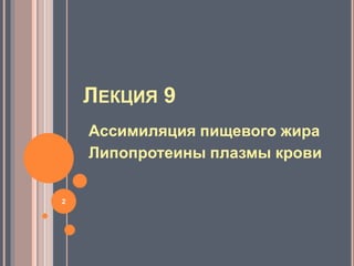 Лекция охватывает темы обмена липидов, ассимиляции пищевого жира и биохимии липидов, подчеркивая их критическую роль в здоровье и развитии заболеваний, таких как метаболический синдром. Основное внимание уделяется процессам переваривания, всасывания и транспорта жиров, а также классификации и функции липидов в организме. Знание биохимии липидов необходимо для профилактики заболеваний и понимания механизма их возникновения.