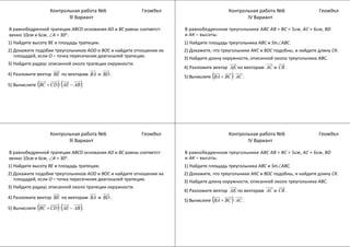 Документ содержит задания контрольной работы по геометрии, включая задачи на подобие треугольников, вычисление площадей, нахождение окружностей и разложение векторов. Приведены варианты для разных геометрических фигур: прямоугольных треугольников, параллелограммов и равнобедренных трапеций. Каждое задание включает конкретные параметры и математические операции для решения.