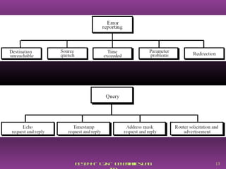 Protokol ICMP (Internet Control Message Protocol) digunakan untuk melaporkan kesalahan dan mengelola komunikasi antara router dan sumber asli saat pengiriman datagram IP. ICMP menyampaikan pesan kesalahan serta informasi kontrol yang membantu administrator jaringan memperbaiki masalah yang terjadi pada jalur pengiriman. Selain itu, ICMP juga memiliki fungsi debugging melalui pesan echo request/reply yang memastikan sistem transport bekerja dengan baik.