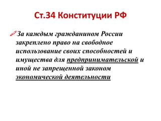 Документ посвящен основным аспектам предпринимательской деятельности в России, включая законодательное регулирование, цели и социальную направленность бизнеса. Рассматриваются различные формы предпринимательства и принципы, такие как свобода конкуренции и законность. Также подчеркивается необходимость государственной регистрации и лицензирования предпринимателей.