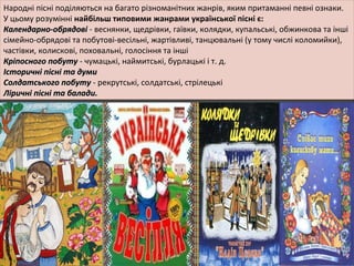 Народні пісні поділяютьсяна багато різноманітних жанрів, яким притаманні певні ознаки.