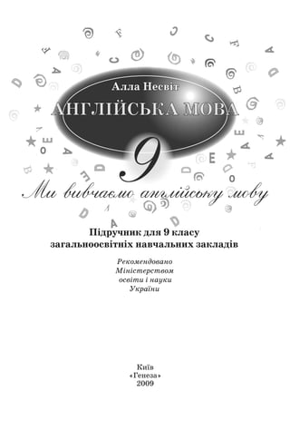 The document appears to be the front matter or introduction to an English language textbook for 9th grade students in Ukraine. It includes information about the authors, experts who reviewed the textbook, those responsible for preparing it for publication. It also provides bibliographic information about the textbook such as the title, publisher, date of publication, and ISBN number. The introduction explains that the textbook is designed to teach English communication skills, including listening, speaking, reading, and writing, according to the national curriculum for teaching foreign languages in Ukraine. It describes the organization of the textbook into 7 chapters and additional materials.