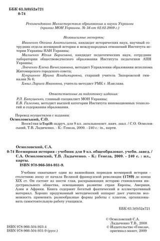 Документ представляет собой учебник по всемирной истории для 9 класса, рекомендованный Министерством образования и науки Украины. Он охватывает ключевые события и изменения в истории с конца XVIII до конца XIX века, включая индустриализацию и буржуазные революции, а также формирует критическое отношение к социальным и политическим процессам того времени. Учебник включает богатый фактический материал и методы для организации учебного процесса, направленные на развитие знаний и навыков учащихся.