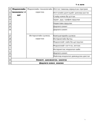 анги 20 Мэдээллийн Мэдээллийн технологийн Илтгэл тавихад зориулсан програм 21 технологи 1 4 хэрэглээ Илтгэлийн дэлгэцийг шинээр үүсгэх цаг 22 Слайд нэмэх ба устгах 23 Зураг , дуу , график оруулах 24 Хөдөлгөөн оруулах 25 Дадлага ажил 26 Дадлага ажил 27 Интернэтийн сүлжээ , Компьютерийн сүлжээ 28 хэрэглээ Интернетийн бүтэц 29 Мэдээллийг хайх ба цуглуулах 30 Мэдээллийг нэгтгэх , илгээх 31 Интернетээс мэдээлэл хайх 32 Дадлага ажил 33 Майлээр мэдээлэл дамжуулах дасгал 34 Хяналт , шинжилгээ , үнэлгээ 35 Дадлага ажил , анализ 2